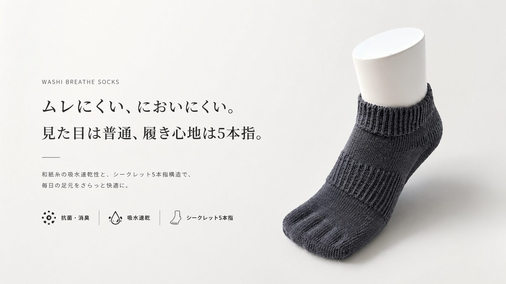 和紙糸の吸水速乾性と、シークレット5本指構造で、